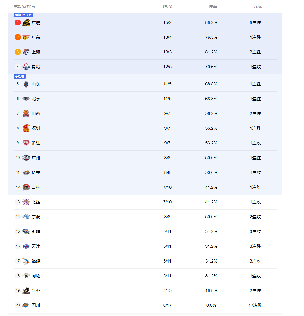 CBA最新积分榜出炉!广东逆袭重回第2,北京第6,辽篮第11