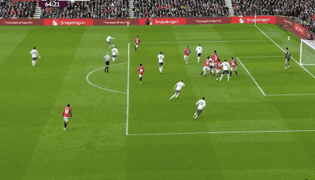 第21分钟,B费开出角球,马奎尔头球摆渡,阿玛德的头球攻门颇具威胁,马丁内斯飞身将球挡出。